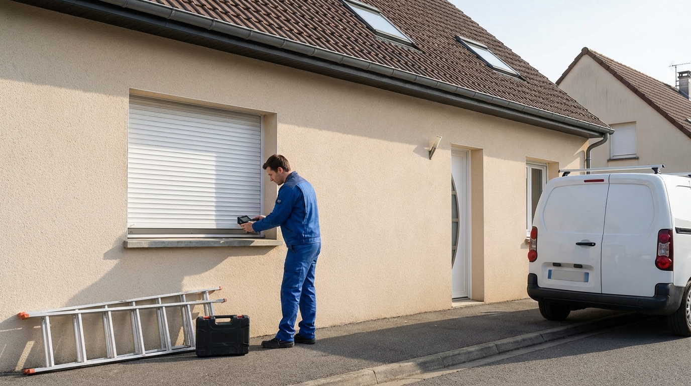 Motorisation de volets roulants : forfait comprenant pièces, main-d’œuvre et déplacement pour transformer votre volet roulant manuel en modèle motorisé, à partir de 449 € TTC. (Le tarif peut varier selon les dimensions du volet et le type de commande choisi).